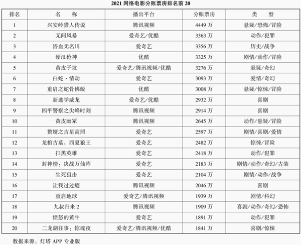 另一方面,各平台还在积极探索“合作”,以联映的形式发行网络电影。电影工业美学强调生产制作层面的合作,强调协作、联合,达到共赢。[20]而各平台联合拼播的形式,一定程度上与笔者所提倡的工业美学理念不谋而合。根据爱奇艺网络电影发布的《2021中国网络电影行业年度报告》数据显示,“2021年以拼播形式上新的网络电影共39部,与2020年的21部相比上升18部;2021年拼播网络电影累计正片有效播放量15.9亿,相对于2020年3.7亿的累计正片有效播放,提升了333%。”[21]2021年通过分账票房破千万的拼播网络电影包括:《无间风暴》(3363万分账票房,爱奇艺/优酷联合播出)、《黄皮子坟》(3276万票房,爱奇艺/腾讯视频/优酷联合播出)、《新逃学威龙》(2932万票房,爱奇艺/优酷联合播出)、《重启地球》(1939万票房,爱奇艺/腾讯视频联合播出)、《二龙湖往事:惊魂夜》(1841万票房,爱奇艺/腾讯视频/优酷联合播出)、《水怪2:黑木林》(1783万票房,爱奇艺/优酷联合播出)、《卸岭秘录》(1669万票房,爱奇艺/优酷联合播放)、《狂鼠列车》(1443万票房,爱奇艺/优酷联合播放)、《火线突围》(1440万票房,爱奇艺/优酷联合播放)、《再战江湖(2021)》(1421万票房,爱奇艺/腾讯视频/优酷联合播放)、《狂鳄海啸》(1356万票房,爱奇艺/优酷联合播放)。[22]平台重视合作,联合发行,有望让作品全网化最大化传播。从某种角度看,这也是一种网络电影的“网络化生存”[23]。